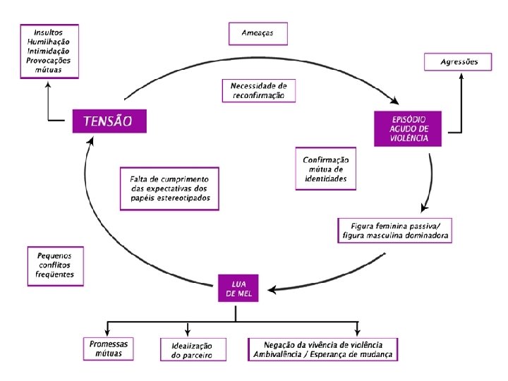 Ciclos da Violência I. Tensão Essa fase se caracteriza por agressões verbais, crise de ciúmes, destruição de objetos e ameaças. A mulher procura acalmar o agressor, evitando discussões, assim a mulher vai tornando-se mais submissa e amedrontada. Em diversos momentos a mulher sente culpa e se acha responsável pela situação de violência em que vive, quando não procura relacionar a atitude violenta do parceiro com o cansaço, uso de drogas e álcool. II. Explosão Essa fase é marcada por agressões verbais e físicas graves e constantes, provocando ansiedade e medo crescente. Essa etapa é mais aguda e costuma ser mais rápida que a primeira etapa. III. Lua de Mel Depois da violência física, o agressor costuma se mostrar arrependido, sentindo culpa e remorso. O agressor jura nunca mais agir de forma violenta e se mostra muito apaixonado, fazendo a mulher acreditar que aquilo não vai mais acontecer.