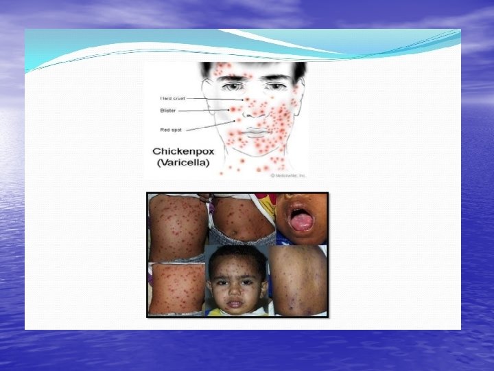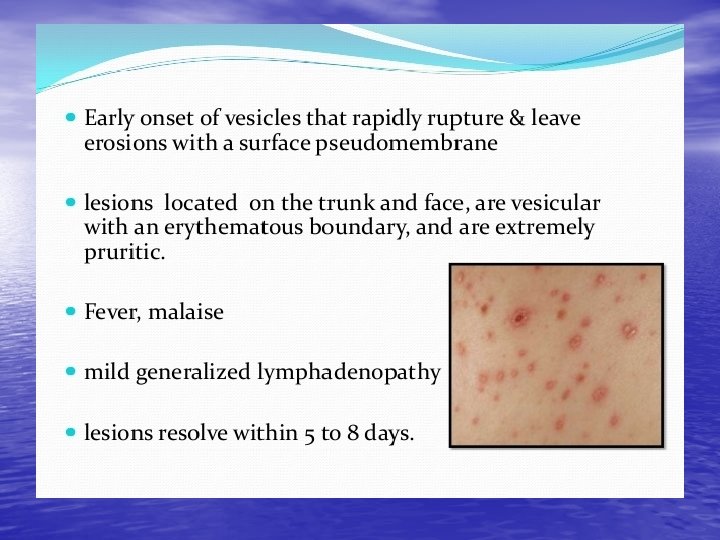 Varicella-Zoster • Primary disease (Varicella, Chickenpox): • Self-limited; • Common in children • Vesicular eruption of trunk and head, neck occuring in crops, few • • oral lesions Systemic signs/symptoms-fever, melaise… Symptomatic treatment • Secondary disease (zoster, shingles): • • • Self-limited; Adults; Rash, vesicles, ulcers unilateral along dermqatom, rare intraorally; Post herpetic pain can be severe immunompromised and lymphoma patients at risk; Treated with acyclovir and analogs