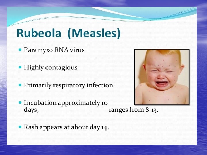 Measles (Rubeola) Etiology: • Measles virus(DNA virus) is spread by airbone droplets through the respiratory tract. Clinical Features: • Disease of children; • Seasonally appearing; • Prodromal symptoms: fever, malaise, conjunctivitis, photophobia, and cough develop; • Koplik’s spots precede maculopapular skin rash in the buccal mucosa. • There is no specific treatment (bed rest, adequate diet, fluids, analgesics)