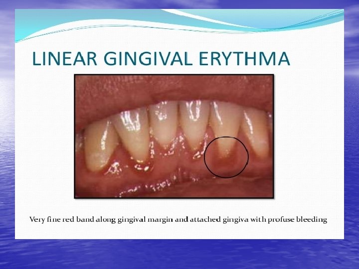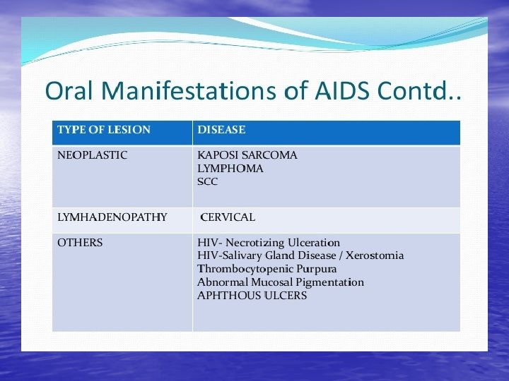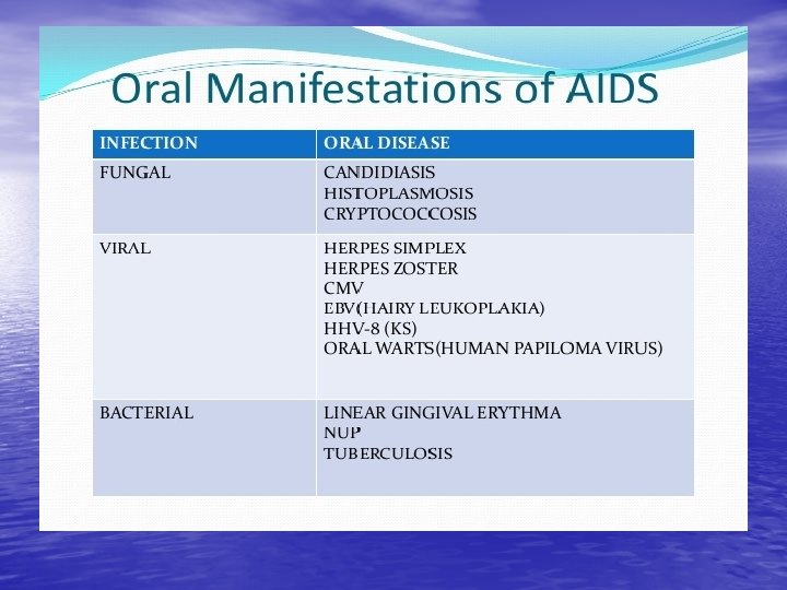 Oral manifestation of HIV infection can be divided into three categories: • Group 1 lesions are strongly associated with HIV • • infection ( oral candidosis, linear gingival erythema, necrotizing gingivatis, necrotizing periodontitis); Group 2 lesions are less commonly associated with HIV infection (necrotizing stomatitis, melanotic hyperpigmentation, thrombocytopenic purpura, bacterial, viral infection); Group 3 lesions are seen in HIV infection ( oral infection with actinomyces israelii, escherichia coli, klebsiella pneumoniae)