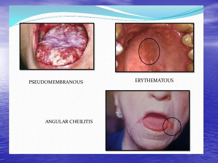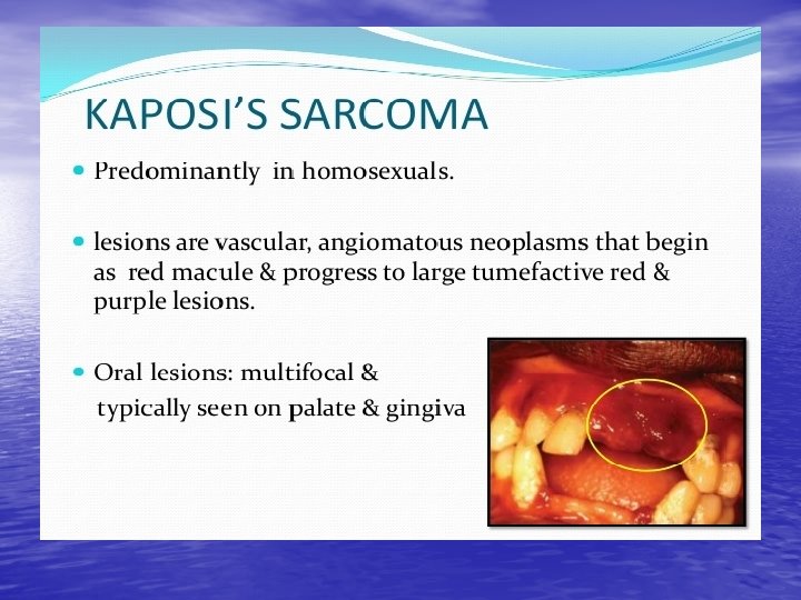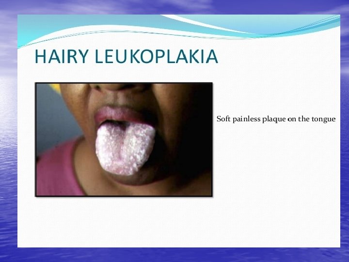 ACQUIRED IMMUNODEFICIENCY SYNDROME (AIDS) • HIV infection is associated with different lesions in the oral cavity – Candidiasis – Herpetic vesicles – Other oppurtunistic infections – Kaposi’s sarcoma: multifocal vascular tumor, present in 25% of AIDS patients; HSV 8 – Hairy leukoplakia: white patches with hairy surface: • caused by EBV • rare, but seen mainly in AIDS • histology shows acanthosis, hyperkeratosis