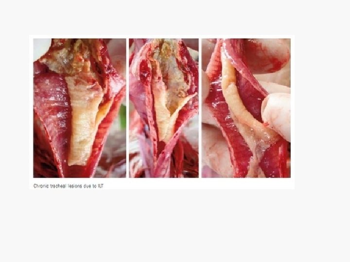 PM. Lesions • Severe laryngotracheitis, with bloody exudate in the trachea. • an occluding pseudomembrane or cheesy plugs in the trachea, death having occurred from suffocation. • bloody peak or blood on the face, head or feathers. • In less pathogenic outbreaks, mild conjunctivitis and sinusitis
