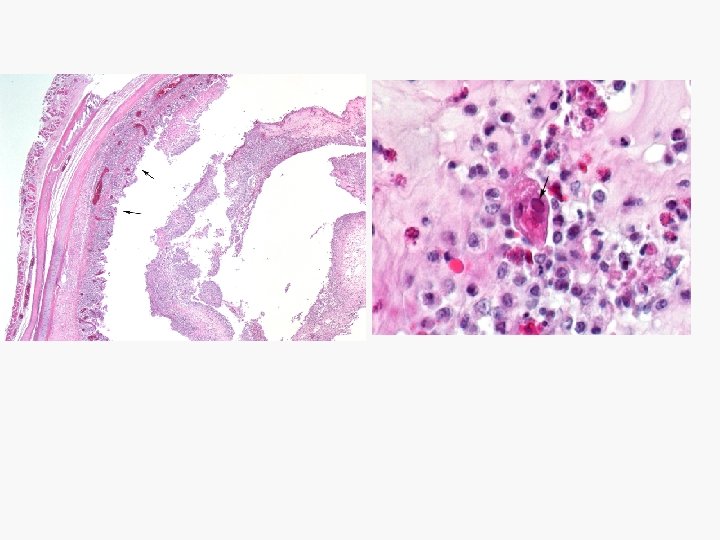 Microscopical lesions ü at the first few days of the disease reveal intranuclear inclusion bodies in epithelial lining the trachea. ü Desquamate necrotizing tracheitis.