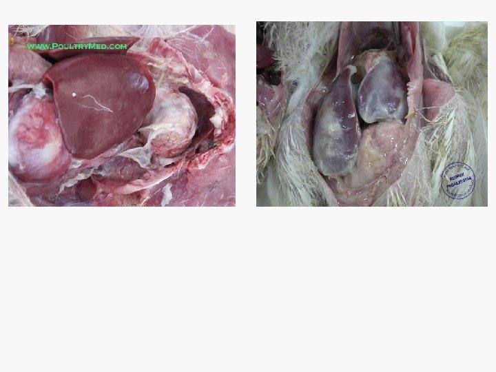 Gross Lesions • 1) Airsacculitis: • Lesions may follow vaccination or infection with Mycoplasma, 1 B, NDV, and ILT. • Lesions in this type are characterized by thickened air sacs which instead of being thin and glistening become thick, dull, and opaque. In severe cases caseous material in the air sacs are present.