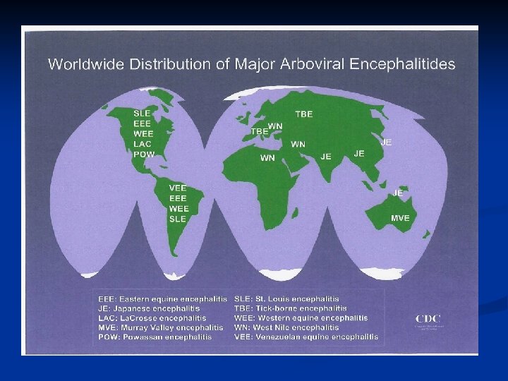 Primary Cause n n n Arboviruses are the most common causes of viral encephalitis Arbovirus stands for arthropod-borne viruses There are 3 virus families associated with encephalitis n n n Togaviridae (Alphavirus) – most common Flaviviridae (Flavavirus) Bunyaviridae (Bunyavirus)