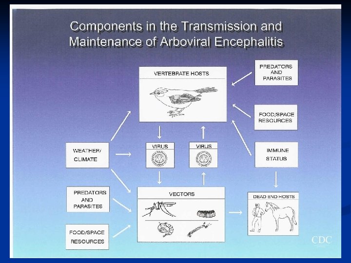 Transmission cont. . n n n Infection occurs when the infected arthropod takes a blood meal Most cases of arboviral encephalitis occur from June – September, when arthropods are most active In warmer parts of the country, cases can occur year-round