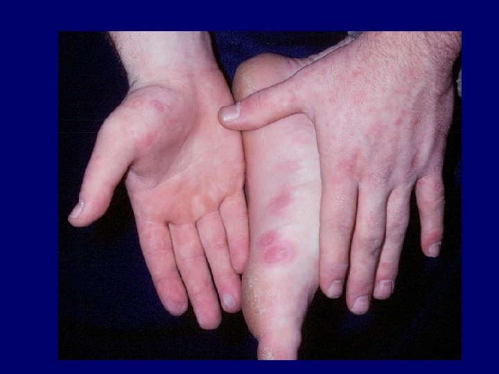 Parvovirus B 19 n Erythema infectiousum, Fifth Disease n Epidemiology n n Clinical Presentation n n Fever, mild URI Arthralgias/arthritis (especially young females) Aplastic anemia (hemoglobinopathies) Fetal hydrops (complication of infection during pregnancy) Exanthem n n n Incubation 4 -14 days n Most contagious before onset of rash “Slapped cheek, ” circumoral pallor Maculopapular, “lace-like, ” reticular Diagnosis /Treatment n Serology, PCR