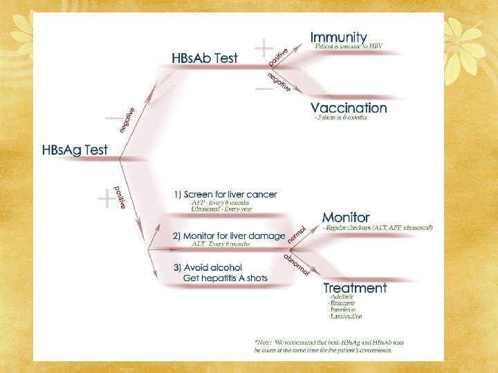 When to Treat for Chronic 2)HBe. AG negative Hepatitis HBV DNA(copies/ml) ALT Recommendation <104 Normal No tx necessary, inactive carrier >104 Normal Liver Biopsy , treat if abnormal >104 Elevated Oral agents or PEG IFN + or - w/ compensated cirrhosis Elevated or normal Oral agents, not PEG IFN + or - w/ uncompensated cirrhosis Elevated or normal Oral agents, not PEG IFN