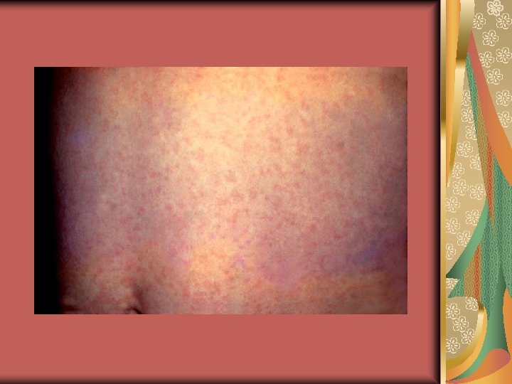 Differential Diagnosis of measles German measles It is not as severe as measles, no conjunctivitis , photophobia or Koplik’s spots and there is lymphadenopathy esp. of occipital and postauricular groups. Roseola infantum : It affects younger children and the rash appears after subsidence of the fever Scarlet fever: The rash is diffuse and blanchable with circumoral pallor. There is exudative tonsillitis , cervical lymphadenitis and Leucocytosis instead of leucopenia in measles. Drug rash