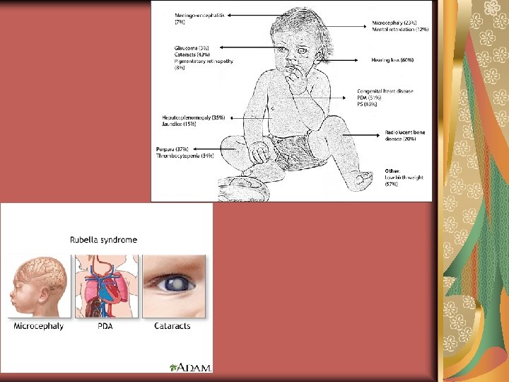 –Congenital heart disease (PDA, pulmonary stenosis, VSD). – MR, microcephaly or hydrocephalus. –Viral interstitial pneumonia, hepatitis, thrombocytopenic purpura and anemia due to persistent viral infection