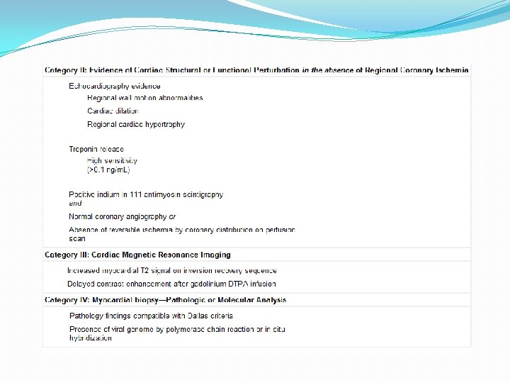 Lab investigations �CK or CK-MB is too insensitive –overall 8% �Troponins are more useful when high sensitivity thresholds are used. �Serum trop T >0. 1 ng/ml is used as cut off-sensitivity can be increased from 34% to 53% without compromising the specificity(94%), PPV-93% & NPV-56%. Lauer et al J Am Coll Cardiol. 1997; 30: 1354– 1359. �Trop I – sensitivity 34% but specificity was 89% Smith et al Circulation. 1997; 95: 163– 168 �Other biomarkers like cytokines, complements and antiviral or AHA are too insensitive or inadequately standardised.