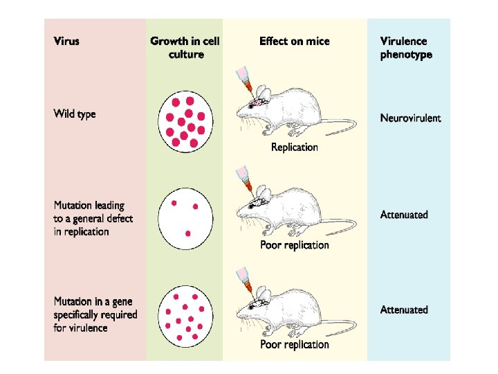 What makes viruses virulent? • A major goal of virology is to identify viral and host genes that determine virulence • Virulence genes are usually identified by mutation: deletion or disruption of one of these genes results in a virus that causes reduced or no disease in a specified system • Viral genes affecting virulence fall into four classes: –Those that affect the ability of the virus to replicate –Those that modify the host’s defense mechanisms –Those that enable the virus to spread in the host –Those which have intrinsic cell killing effects