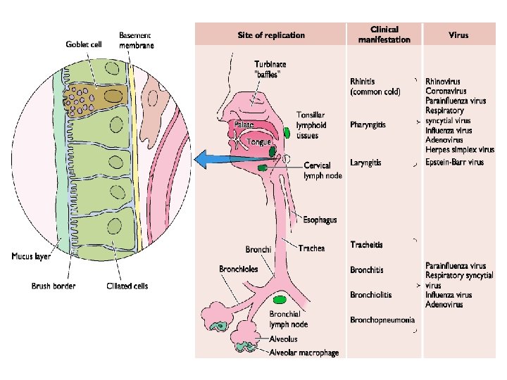 Respiratory tract • Most common route of viral entry • Absorptive area of lung: 140 m 2; ventilation rate 6 L/min • Barriers to infection: swallowing; ciliary action from lower tract; macrophages in alveoli (no cilia or mucus); Ig. A • Viruses enter by aerosolized droplets from cough or sneeze, or contact with saliva • Large droplets lodge in nose; smaller in airways or alveoli