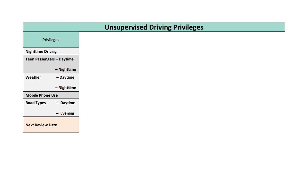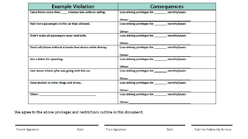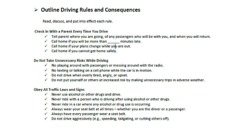 Teen driving risks: 1. 2. 3. 4. 5. 6. Speeding Night Driving Distracted Driving Seatbelt Non-use Passengers Primary Access to a Vehicle 7. Impaired Minimize the risks: Passengers Keep your driving with your. Virginia Have teen share a teens • • • Create athe family-level Enforce minimum after licensure. vehicle with. Driver’s you and other Graduated Licensing driving laws with your teen. family members. system