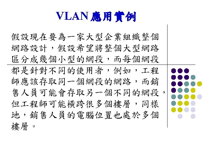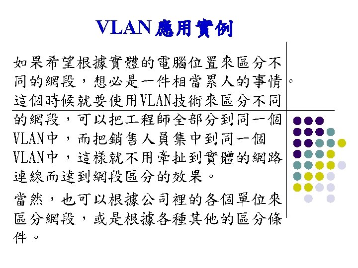Introduction to VLAN (2/2) Motivations 1. 2. 3. 4. Support the requirement of virtual organization Simplify the network management Increase the network resource utilization Enhance the network security 2020/12/3 CSE, NCHU 9