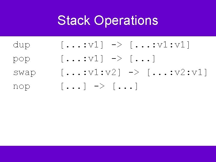 Method Operations ireturn [. . . : i] -> [. . . ] return i and pop stack frame areturn [. . . : o] -> [. . . ] return o and pop stack frame return [. . . ] -> [. . . ] pop stack frame