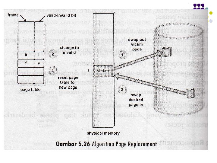 Mekanisme demand paging Langkah-langkah swap-in : l Mencari frame memori utama yang kosong. jika tidak ada dipilih salah satu page dalam frame (victim page) untuk di swap-out. l Swap-in l Memperbarui rekaman di page table mengubah validation=1 l Restart.