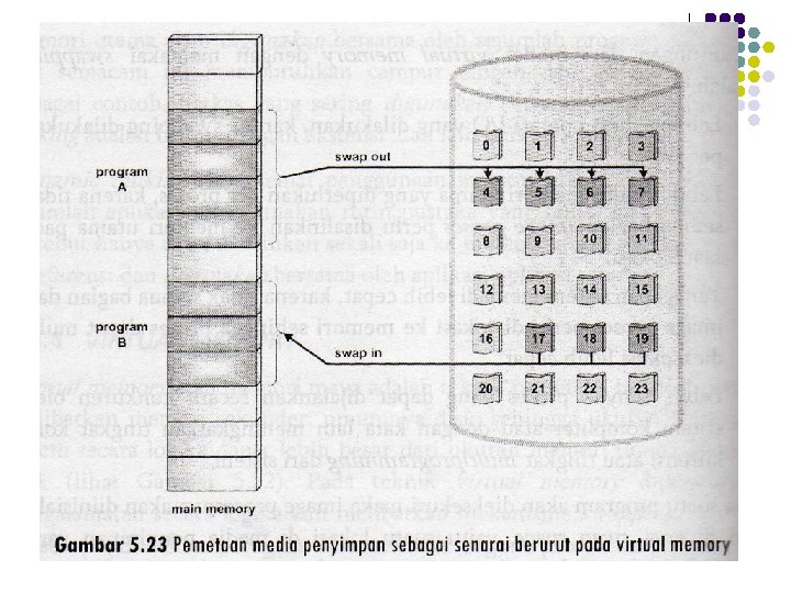 Definisi l Adalah teknik pemetaan memori yang melibatkan memori sekunder, umumnya disk. l Secara sistem logika, ukuran memori lebih besar daripada ukuran memori utama secara fisik. l Melibatkan mekanisme swapping