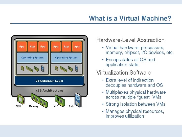 Hardware-assisted Virtualization – Server hardware is virtualization aware – Hypervisor and VMM load at privilege Ring -1 (firmware) – Removes CPU emulation bottleneck – Memory virtualization coming in quad core AMD and Intel CPUs