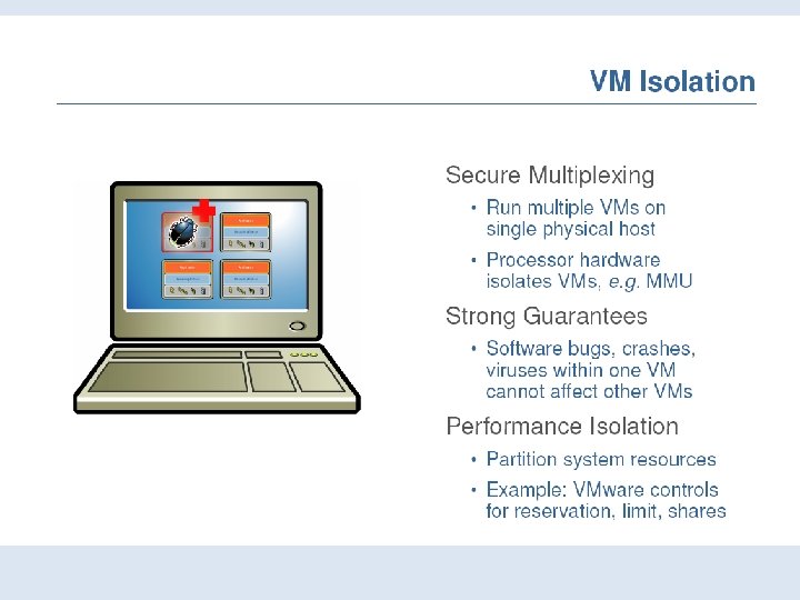 Ilustrasi • Full virtualization (direct execution) – Exact hardware exposed to OS – Efficient execution – OS runs unchanged – Requires a “virtualizable” architecture – Example: VMWare • Paravirtualization • OS modified to execute under VMM • Requires porting OS code • Execution overhead • Necessary for some (popular) architectures (e. g. , x 86) • Examples: Xen