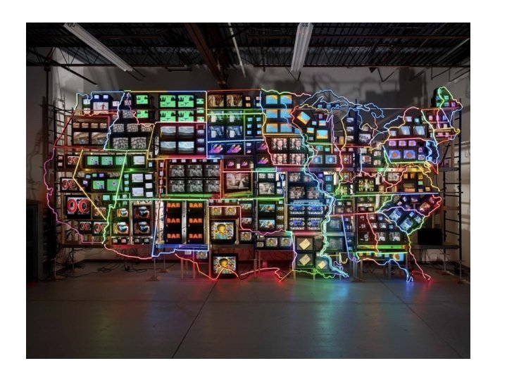 Médium televize TV a video art Nam June Paik Pre-Bell-Man, 1990 socha před Muzeem komunikace ve Frankfurtu nad Mohanem Další snímek: Týž, Electronic Super-highway: Continental U. S. , Alaska, Hawaii, 1995