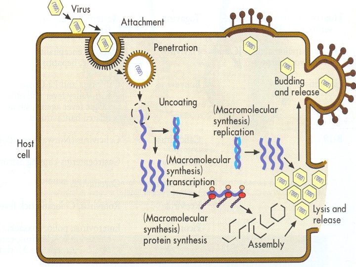 Viral replication 1) Attachment: binding sites must match receptor sites on host cell 2) Penetration: endocytosis occurs and entire virus enters cell 3) Uncoating: separation of the viral genome from the capsid 4) Biosynthesis *genome replication *transcription *translation 5) Maturation: virus particles assembled 6) Release: lysis or budding