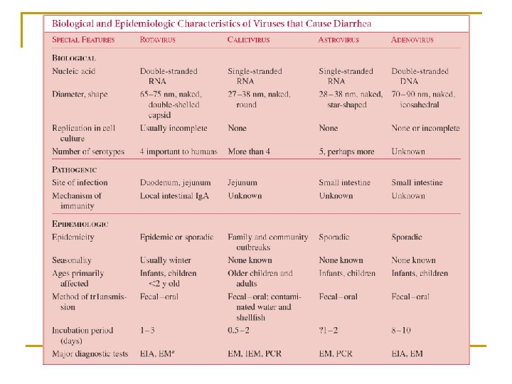 Introducción n n Hasta los 70 s el diagnóstico viral de diarrea era por descarte (bacteria, parásitos) Eliminación viral 108 -10 viriones/gr diarrea Tecnología actual permite mejorar dx Identificado grupos asociados a diarrea aguda *Rotavirus *Calicivirus *Astrovirus *Adenovirus (entéricos)