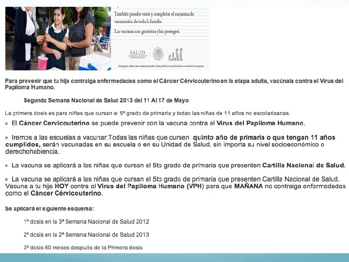 Información relevante de VPH y Ca. CU La infección por VPH es muy común El Ca. CU siempre es causado por el VPH Tener VPH no significa que la mujer desarrollará Ca. CU. Más del 90% de las infecciones detectadas se eliminan en los siguientes 2 años. La infección con VPH de alto riesgo que persiste por más de 4 años aumenta el riesgo al cáncer por 100 x