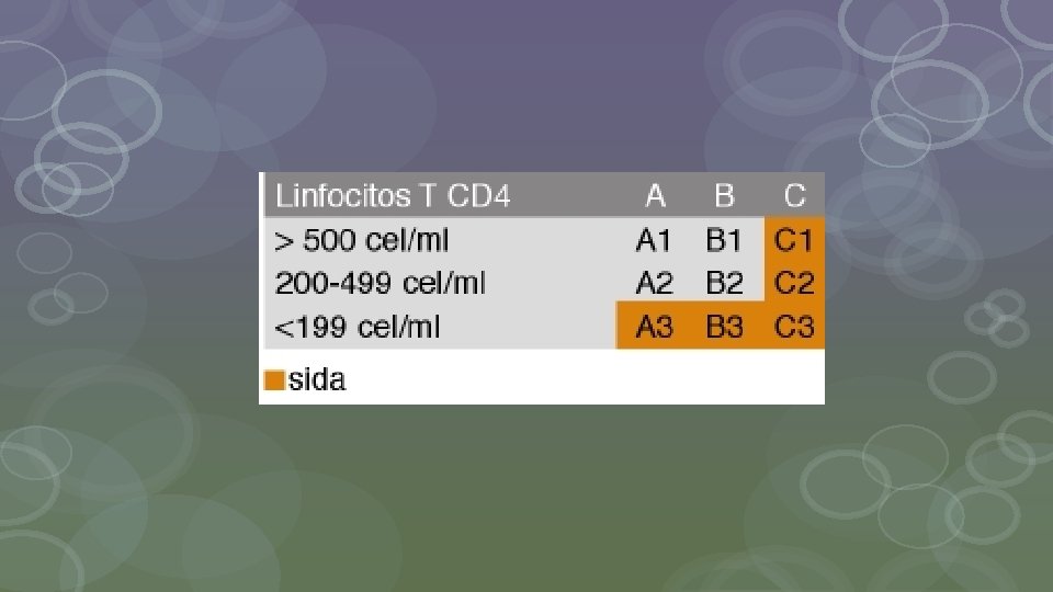 Angiomatosis asociadas • Enfermedades bacilar • Cuenta de linfocitos T CD 4 Clasificación Candidosis orofaringea/v ulvovaginal VHZ Categoría A Infección asintomática Categoría B Leucoplasia Linfadenopatía oral Síntomas Infecciónconstitucional aguda es Displasia/Carc inoma in situ