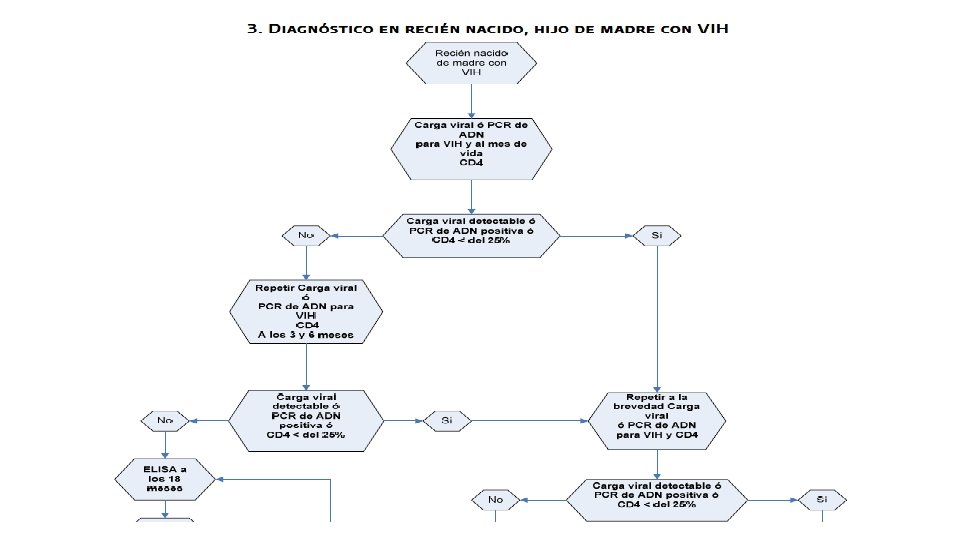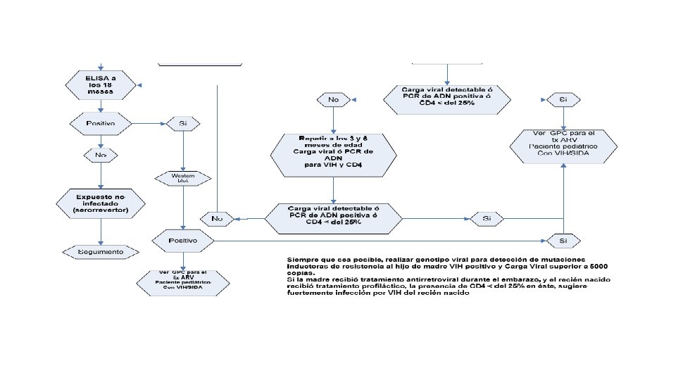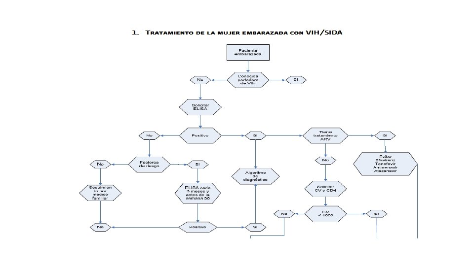Mujeres que no se conocen ceropositivas Mujeres que se conocen ceropositivas ELISA a toda embarazada o en parto CV de inicio, a las 2 -6 s, y luego c/mes hasta ser indetectable Si fue -, prueba 12 semanas después, o antes de las 36 Cuenta de Cels T CD 4 c/3 meses Confirmar con western blot BH, QS, Glucosa en sangre, PFH, electrolitos