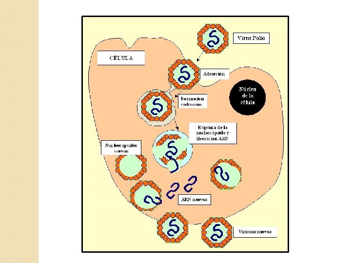 Replicación viral � Cuando el VP entra en contacto con la célula adecuada, se une a los receptores celulares quedando adsorbido a la membrana celular. � Penetra por medio de una vesícula llamada endosoma, que le transporta al interior de la célula. � Dentro del endosoma, unas enzimas celulares rompen la nucleocápside (proteasas) y liberan el ARN viral al citoplasma. � El ARN se introduce en un ribosoma celular, desde donde inicia su replicación, sintetizando los componentes necesarios para formar viriones nuevos. � La célula sufre inhibición de su metabolismo en perjuicio para ella misma.