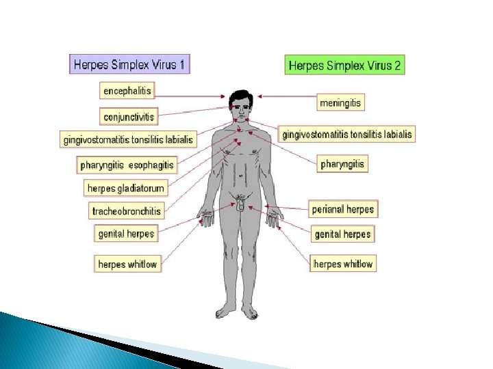Herpes simplex 1 y 2 * * EPIDEMIOLOGIA Afecta a humanos de todas las edades La prevalencia de anticuerpos para HSV 1 y 2 aumenta con la edad. Anti- HSV 2 aumenta durante la adolescencia Mecanismo de transmisión contacto directo con un infectado * (sintomático o asintomático)