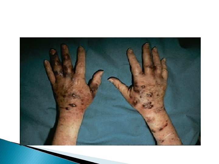 Varicela � Cada lesión empieza con una pápula roja de 2 -4 mm de diámetro � Desarrolla una forma irregular (pétalo de rosa) en forma de vesícula pequeña sobre la superficie: apariencia de rocío sobre un pétalo de rosa. � Sitios preferentes: cara, cuero cabelludo y tronco. Menos en las extremidades.