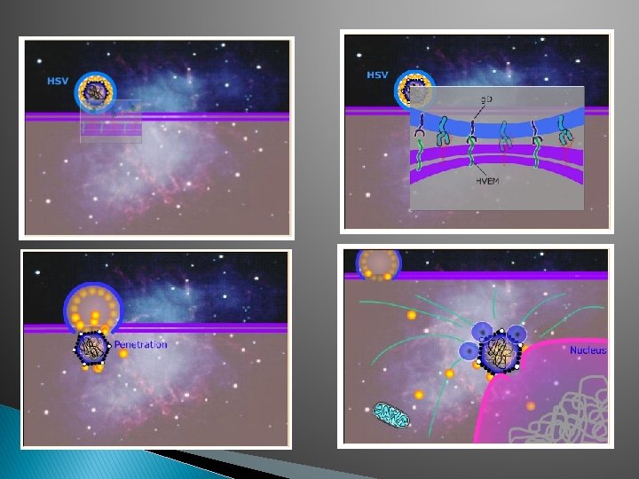 Virus Herpes simplex 1 y 2 • • • Causan enfermedades frecuentemente benignas pero pueden ser severas. En la lesión inicial todos los casos son muy parecidos. Una vesícula clara conteniendo virus infeccioso con una base eritematosa. – Rocío sobre un pétalo de rosa • Pústulas, lesiones costrosas y úlceras se desarrollan posteriormente.