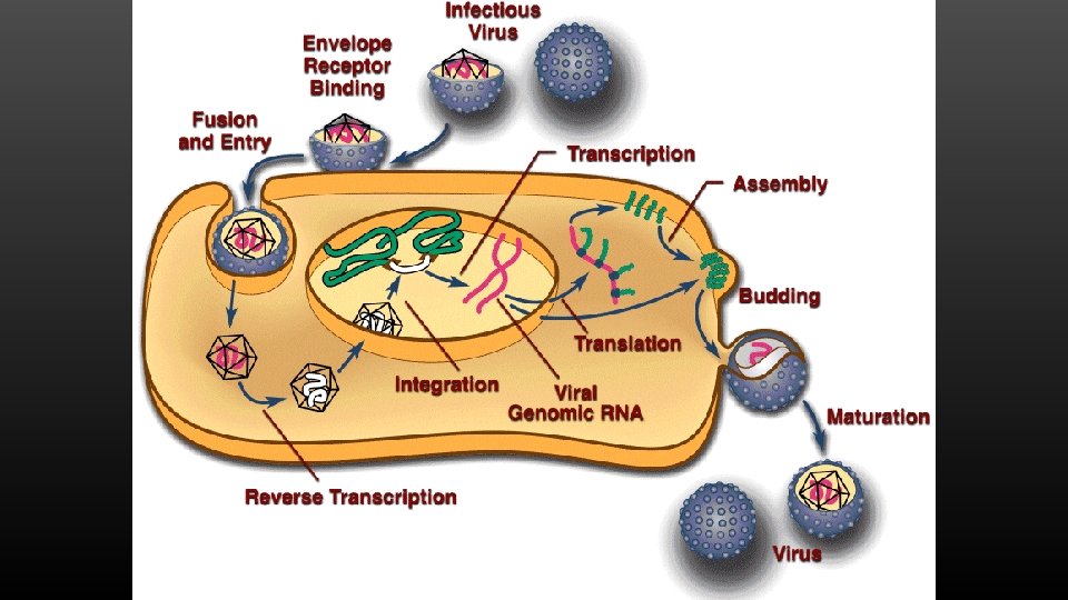 Lysogenic Cycle • Attachment and entry into the cell through the cell membrane • Provirus formation • Viral DNA becomes part of the host chromosome • Cell Division • Virus is inactive but is replicated each time the host cell divides • Provirus leaves chromosome • Virus enter lytic cycle • Host cell slowly releases new viruses
