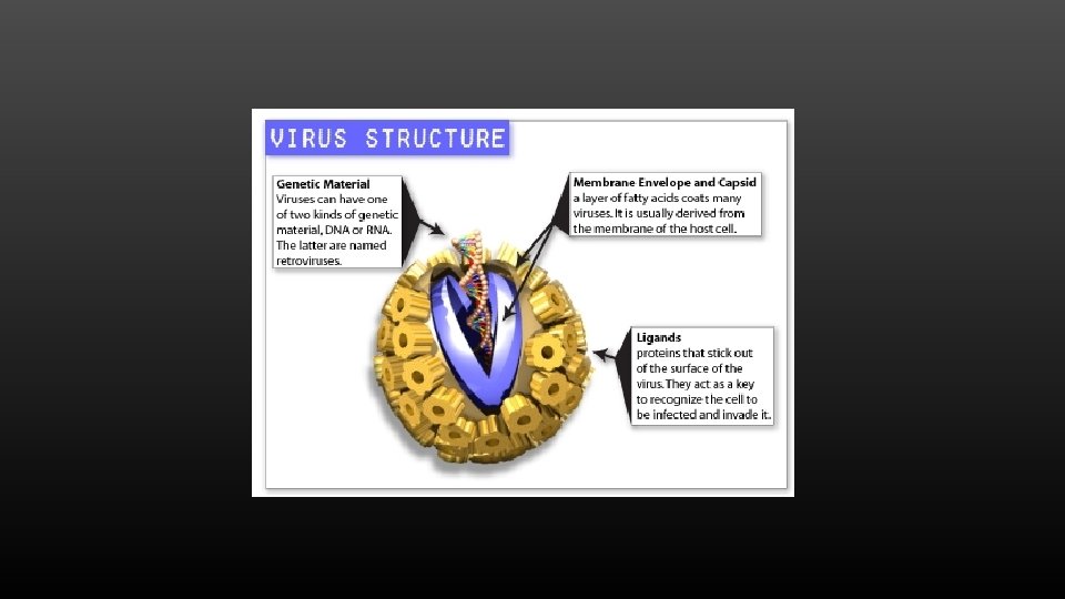Structure • Inner core of nucleic acid (DNA or RNA) • Surrounded by a protein coat • Protein coat gives viruses many different shapes Flu HIV Ebola