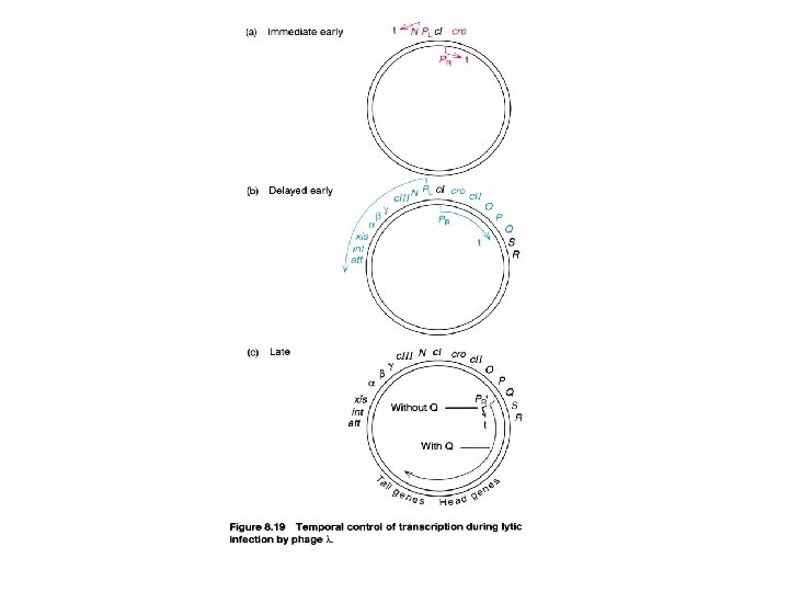 Immediate early A cascade regulation in lytic phase : accompanied with the similar organization of the genetic map Cascade: positive Begin at the phage genome starts to replicate (i. e. assembly proteins) Gene expression cascade in a positive control manner (delayed early) Each set of genes are necessary for the expression of next genes small number of regulatory switches with cluster organization in a sequential expression order to Maximize economy See next