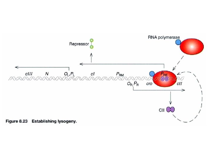 Lysogenic phase of λ phage The role of c. II in lysogenic phase (establishment) Acts at PRE to transcribe c. I Acts at PI to transcribe int (for integration) Acts at Panti-Q to transcribe antisense RNA of Q m. RNA, ensures degradation of Q The role of c. I in lysogenic phase (maintenance) Autogenous circus to turn off all genes via PRM and OR , OL Block PR and PL gene expression Integration into genome All immediate early and delayed early genes are turn off