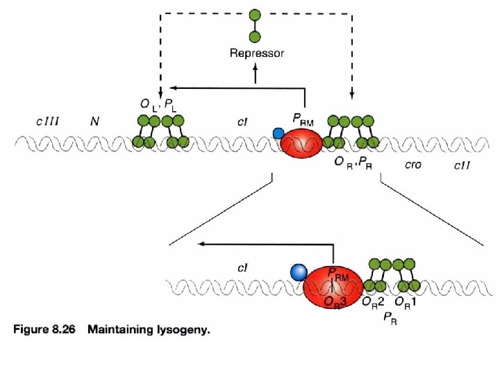 Lysogeny: maintained by c. I repressor By denying RNA polymerase access to these promoters, a repressor protein (encoded by c. I) prevents the phage genome from entering the lytic cycle. c. I repressor: 1. maintains the lysogenic state 2. provides immunity c. I repressor PRM an inefficient promoter for c. I (lacking ribosome binding site). RM= repressor maintenance