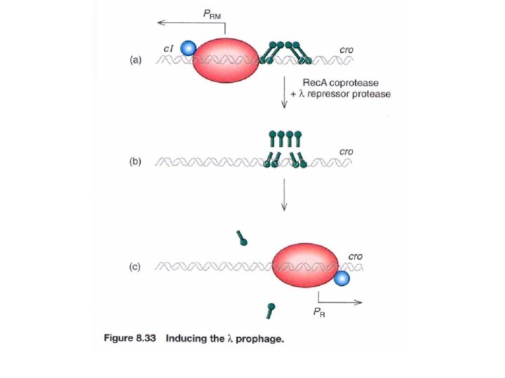 Mechanism of Lysogen Induction by UV Light UV irradiation damages DNA and thus activates E. coli’s DNA repair systems. One of the DNA repair proteins, Rec. A, normally functions to repair doublestranded DNA breaks. However, Rec. A also acts as a coprotease to facilitate the cleavage of CI (lambda repressor). CI itself has latent autoproteolytic activity, but requires the Rec. A coprotease to stimulate this activity. Lysogenic induction would proceed as follows: • UV light damages DNA and activates Rec. A • Rec. A binds to CI • The Rec. A-CI complex cleaves CI (autoproteolysis) • In the absence of CI, transcription from the right and left promoters (PR and PL) resumes. • CRO is produced, which inhibits the synthesis of CI and stimulates expression of lytic genes. • Phage particles are formed and the cell is lysed.