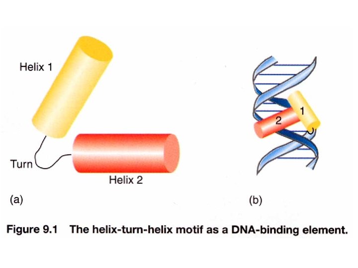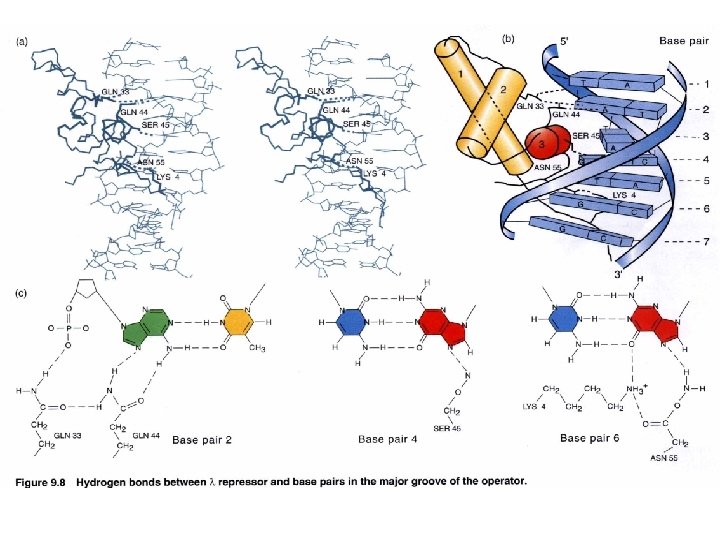 DNA binding specificity AAs of helix make directly contact with bases of the operator Chimera approach to prove the specificity of binding (protein-DNA). Recognition helix: Helix 3 forms several H-bonds with DNA bases contribute to binding specificity Binding helix: Hydrophobic Affinity H-bonds Hydrophobic H-bonds Helix 2 forms H-bonds with phosphate backbone Not for specificity Also the ionic bonds contribute for interactions Keep relationship between helices specificity K contact with G in major groove and phosphate backbone Mutation makes repressor affinity less than ~1000 X