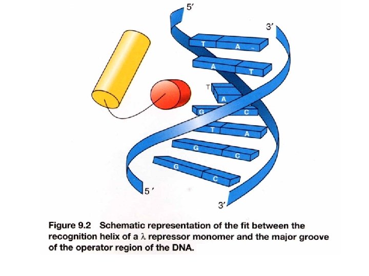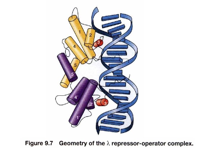 Cooperative DNA binding of repressor dimer 3 repressor-binding sites/operator No identical sequence Separated by 3 -7 bp and AT-rich Where to start binding O 1 has strongest affinity O 1 increases the affinity of O 2 Usually O 3 is not filled with repressor (no enough conc. ) Increases the effective affinity of repressor for the operator at physiological conc. (or at lower conc) OL 1 and OR 1 lie overlapping with RNA polymerase binding sites of PL and PR, respectively. Occupancy of OL 1 -OL 2 and OR 1 -OR 2 physically blocks access of RNA polymerase to the corresponding promoters.