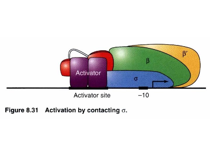 Repressor interacts with RNA polymerase : an autogenous regulation of c. I repressor PRM turn/loop between helix 2 and 3 Both O 1 and O 2 mutations lead to virulence containing acidic patch to interact w/ basic region of RNA polymerase via electrostatic interaction -ve feedback stabilization establishment O 3 O 2 O 1 Stabilize the RNA polymerase binding to PRM promoter site to facilitate c. I transcription (transition from closed complex to open complex) Protein-protein interaction can release energy that is used to help to initiate transcription