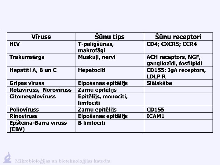 Vīrusu attīstības cikls. Vīrusa attīstības cikla fāzes: adsorbcija Imunoglobulīnu virsdzimta: 1 - poliovīrusa receptors; 2 - HIV (CD 4); 3 – karcinoembrionālie Ag koronavīrusa receptori; 4 –rinovīrusa receptori ICAM-1 (intracellular adhesion molecules)); 5 - ehovīrusu (Vla-2 integrīns); 6 - rinovīrusi (LDL receptors); 7 - koronavīrusi (aminopeptidāze); 8 - gripas (siālskābe glikoproteīnos); 9, 10 leikēmijas vīrusi (katjoniskais aminoskābju vai Na-atkarīgais fosfāta transporta proteīns)