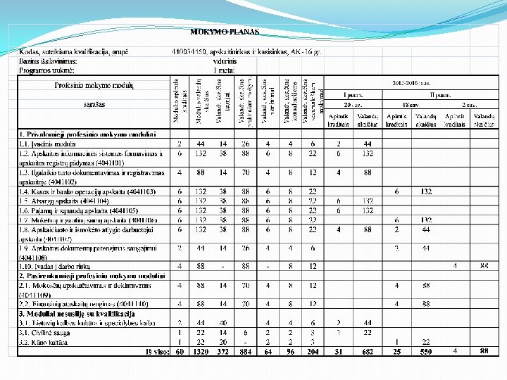 Apskaitininko ir kasininko (valstybinis kodas -440034450) modulinės profesinio mokymo programos vykdymas 2015 – 2016 m. m. 1. Licenzijos papildymas. 2. Teikėjo lygmens programos parengimas 3. Mokymo plano parengimas 4. Mokymo grafiko parengimas 5. Tvarkaraščio sudarymas 6. Ilgalaikis planavimas 7. El. dienyno “Tamo” pildymas
