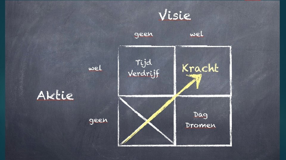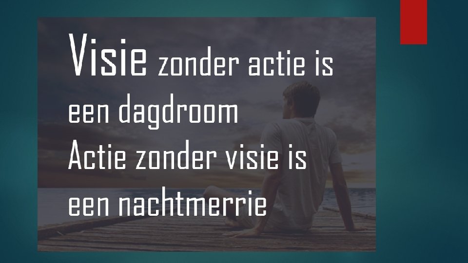 Je moet het geheel inkaderen Visie op de branche (bedrijfsgericht) Hoe zien wij onszelf in de wereld van morgen? Persoonlijke visie (ontwikkelingsgericht) Wat is echt belangrijk voor je? Wat wil je bereiken?