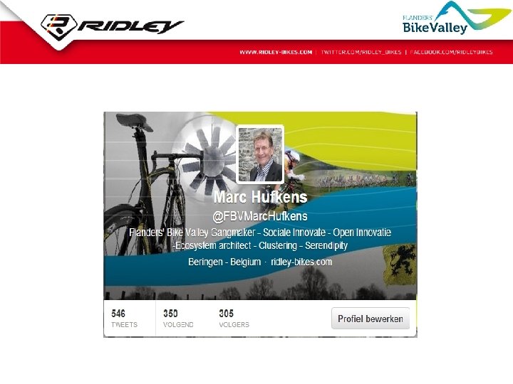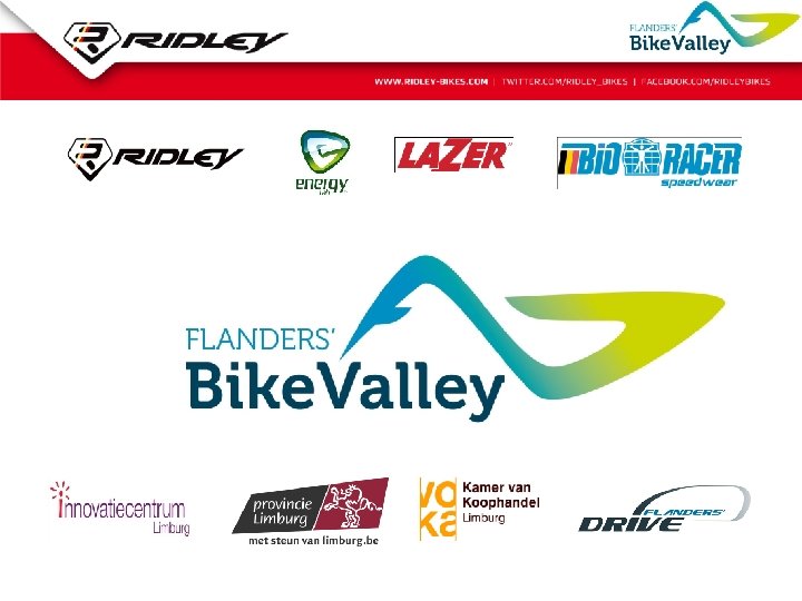 Voorbeelden “Open innovatie” Oktober 2010 : GUM Consortium Green Urban Mobility Project (Recticel, Ocas, Ridley, Hegghe, Zwecko, ACB, Flanders Drive) September 2012 : Flanders’ Bike Valley Cluster. Project Ecosysteem - Katalysator- magneet en kruisbestuiving : -Meest talentvolle medewerkers / ondernemers wereldwijd. -Wonen, Leven, Werken in Limburg met Valley kenmerken -Verankering fietsindustrie in fietsparadijs Limburg -Open innovatie R & D + HR + Marketing + Logistiek + …. .
