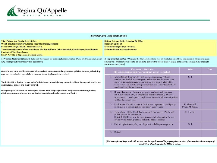 Patient and Family Centered Care Multi-year Plan • Challenges/Gaps/Risks/ - Much work to spread and replicate practices redesigned by patients and frontline staff and physicians. - Lack of EHR and difficulty getting RQHR forms on physicians’ EMR, e. g. Accuro - Have not yet implemented many best practices, e. g. family presence policy, signage - Huge requirement for education/training in all areas and don’t have a region-wide integrated learning system, including monitoring • What isn’t working/What can be improved • Timely disclosure to patients/families and resolution of client concerns in real time • Patient information needs to travel with the patient—advanced directives, blood consent, etc. • “Concern handling is not a department – it is everyone’s responsibility” – processes need to continue to evolve