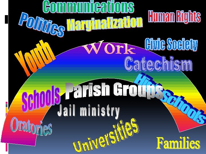 THE FIELD OF APOSTOLATE FOR THE LAITY includes: politics, social realities, the economy, culture, the arts and sciences, the intellectual life, and the means of Social Communications; as well as, other realities which are particularly open to evangelization, such as: Married couples, conjugal life, the family, the education of children, work with adolescents and young adults; professional work, and suffering.