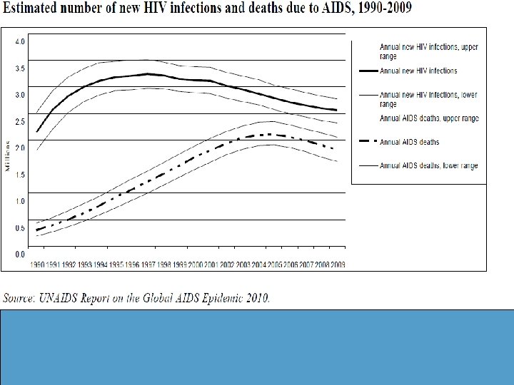 Global summary of the AIDS epidemic 2010 Number of people living with HIV People newly infected with HIV in 2010 AIDS deaths in 2010 Total Adults Women Children (<15 years) 34. 0 million [31. 6 million– 35. 2 million] 30. 1 million [28. 4 million– 31. 5 million] 16. 8 million [15. 8 million– 17. 6 million] Total 3. 4 million [3. 0 million– 3. 8 million] Adults 2. 7 million [2. 4 million– 2. 9 million] Children (<15 years) 2. 3 million [2. 1 million– 2. 5 million] 390 000 [340 000– 450 000] Total 1. 8 million [1. 6 million– 1. 9 million] Adults 1. 5 million [1. 4 million– 1. 6 million] Children (<15 years) 250 000 [220 000– 290 000]